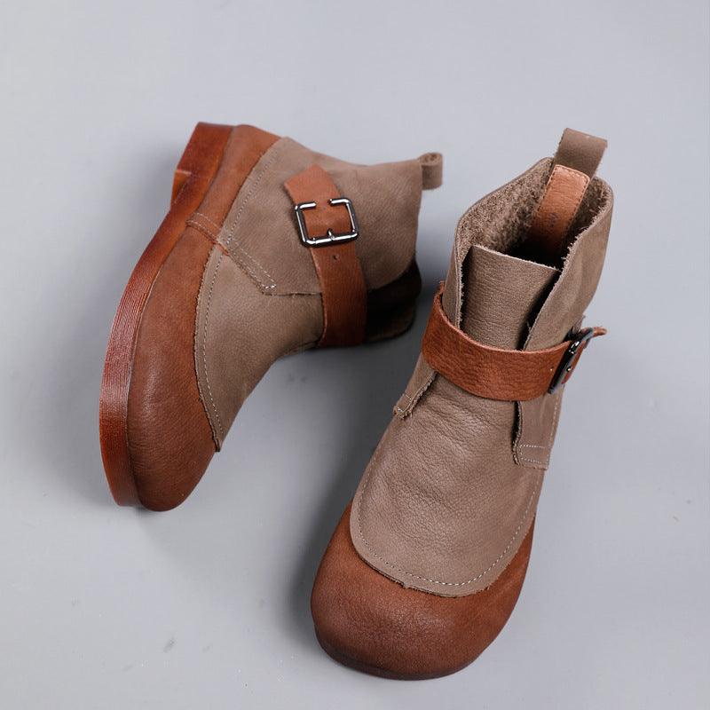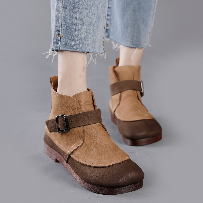 Genuine Leather Women Boots Ethnic Style With Buckle Strap Round Toe Flat New Autumn Winter Handmade Ladies Boots