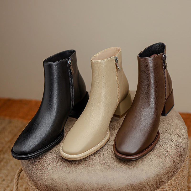 Simple All-match Soft Cowhide Boots Autumn And Winter New Thick Mid Heel Round Toe Brown Ankle Boots For Women