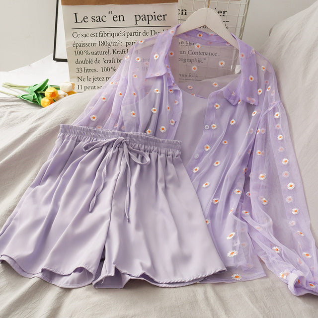 Summer Women Three Piece Sets Casual Linen Tops Shorts Ela